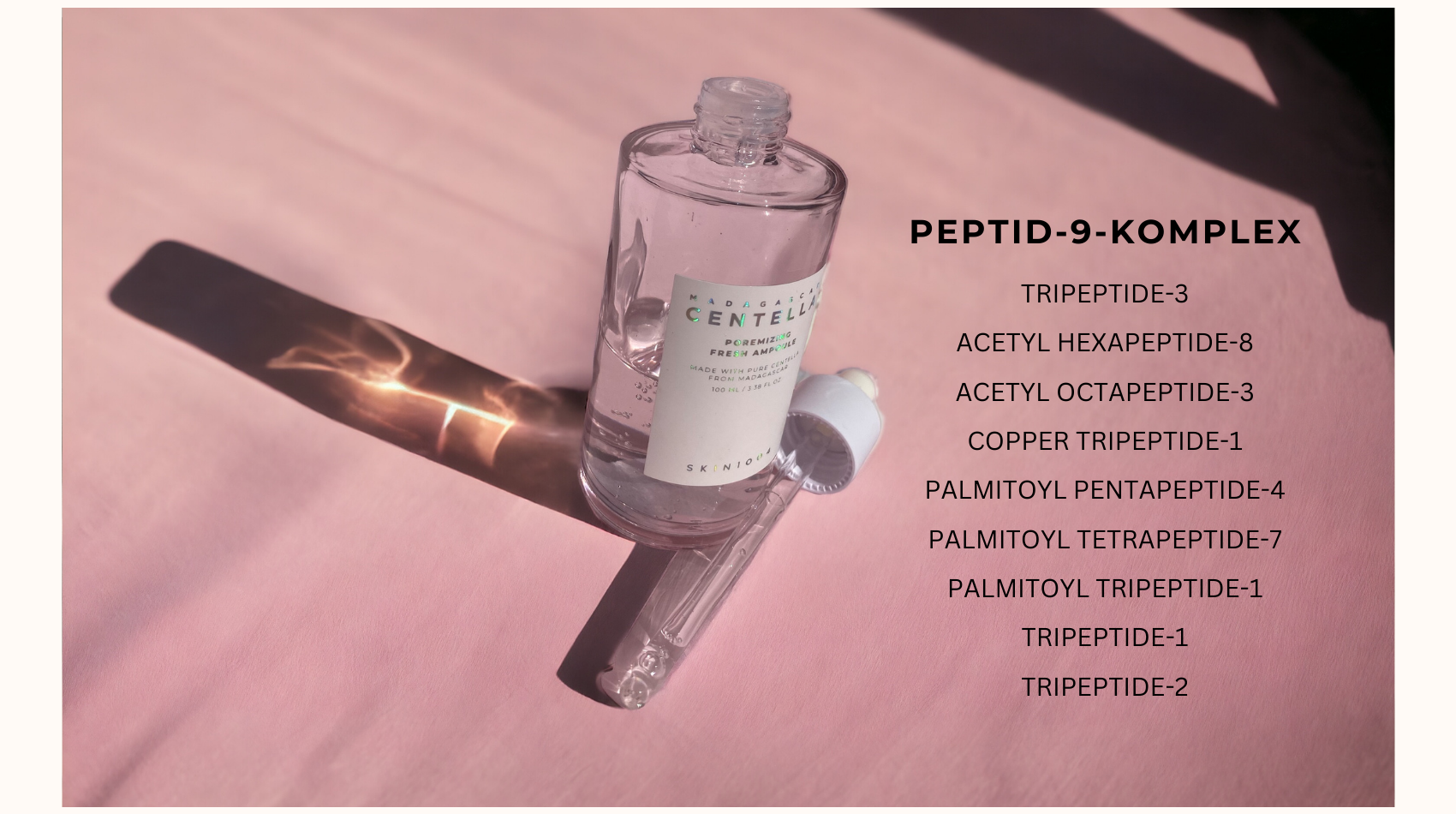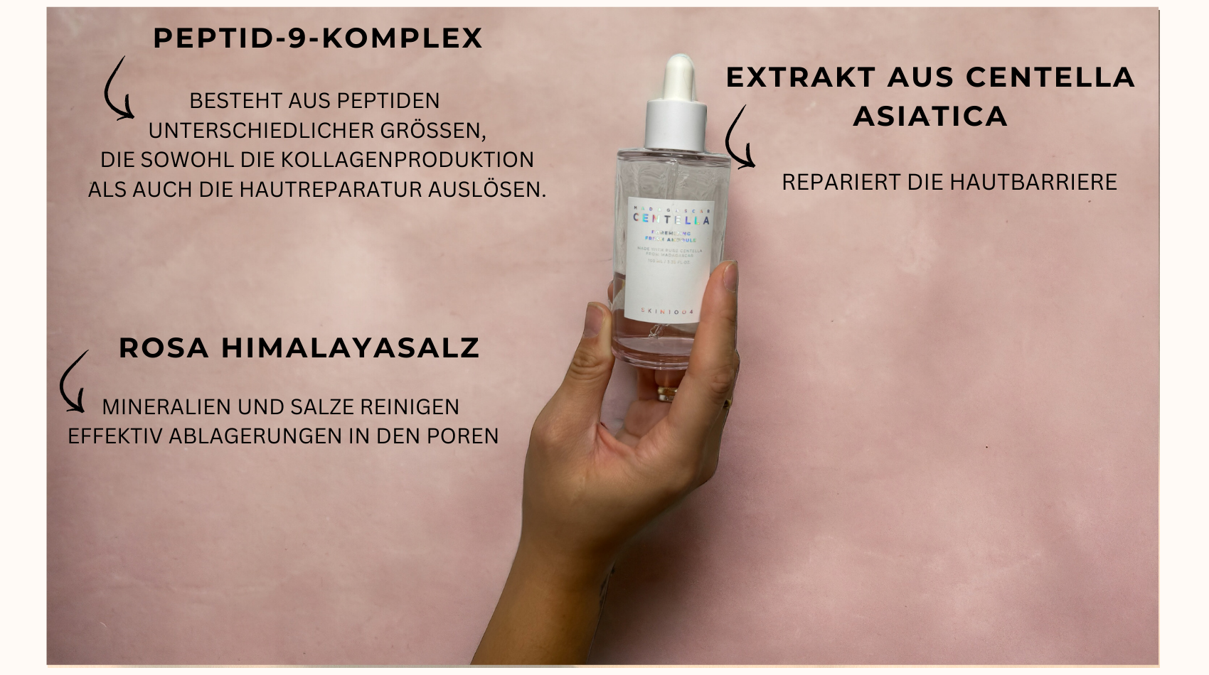 Centella Asiatica-Extrakt (50,47 %) (Beruhigend | Antioxidans | Feuchtigkeitscreme/Feuchthaltemittel), Aqua (Lösungsmittel), Butylenglykol (Feuchtigkeitscreme/Feuchthaltemittel | Lösungsmittel), Propandiol (Feuchtigkeitscreme/Feuchthaltemittel | Lösungsmittel), 1,2-Hexandiol (Lösungsmittel), Aloe Barbadensis-Blattextrakt (Feuchtigkeitsspender/Feuchthaltemittel | Beruhigend | Weichmachend), Glycereth-26 (Feuchtigkeitsspender/Feuchthaltemittel | Weichmachend | Viskositätsregulierend), Hydroxyacetophenon (Antioxidans), Glycerin (hautidentischer Inhaltsstoff | Feuchtigkeitsspender/Feuchthaltemittel), Carbomer (Viskositätsregulierend), Tromethamin (puffernd), Panthenol (Vitamin B5, | beruhigend), Ethylhexylglycerin (Konservierungsmittel), Dinatrium-EDTA (chelatbildend), Dikaliumglycyrrhizat (beruhigend | Feuchtigkeitscreme/Feuchthaltemittel), Ammoniumpolyacryloyldimethyltaurat (viskositätsregulierend), Biosaccharid Gum-1 (beruhigend |). Feuchtigkeitscreme/Feuchthaltemittel), Hyaluronsäure (hautidentischer Inhaltsstoff | Feuchtigkeitscreme/Feuchthaltemittel), hydrolysierte Hyaluronsäure (Feuchtigkeitscreme/Feuchthaltemittel), Natriumhyaluronat (hautidentischer Inhaltsstoff | Feuchtigkeitscreme/Feuchthaltemittel), Hydroxyethylcellulose (viskositätsregulierend), Chamomilla Recutita (Matricaria)-Blume Extrakt (Beruhigend | Antioxidans), Mineralsalze, Tripeptid-3 (Zellkommunikativer Inhaltsstoff), Acetylhexapeptid-8 (Zellkommunikativer Inhaltsstoff | Feuchtigkeitscreme/Feuchthaltemittel), Acetyloctapeptid-3 (Zellkommunikativer Inhaltsstoff | Feuchtigkeitscreme/Feuchthaltemittel), Kupfertripeptid-1 (Zellkommunikativer Inhaltsstoff). Inhaltsstoff | Beruhigend | Antioxidans), Palmitoyl Pentapeptide-4 (Zell kommunizierender Inhaltsstoff), Palmitoyl Tetrapeptide-7 (Zell kommunizierender Inhaltsstoff), Palmitoyl Tripeptide-1 (Zell kommunizierender Inhaltsstoff), Tripeptide-1 (Zell kommunizierender Inhaltsstoff), Tripeptid-2 ( Zellkommunikativer Inhaltsstoff).