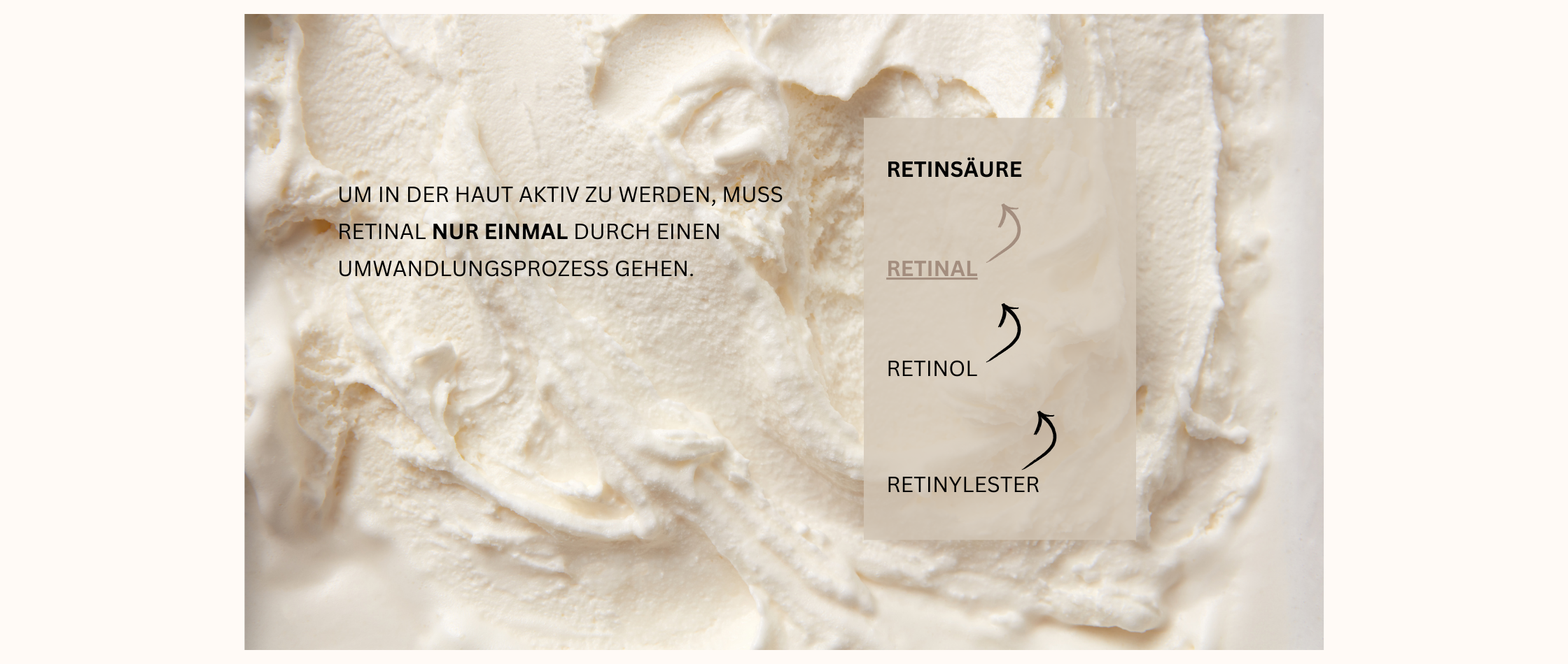 Retinal ist der Zwischenschritt zwischen Retinsäure und Retinol, d. h. es benötigt nur einen Umwandlungsschritt, um in der Haut aktiv zu werden.