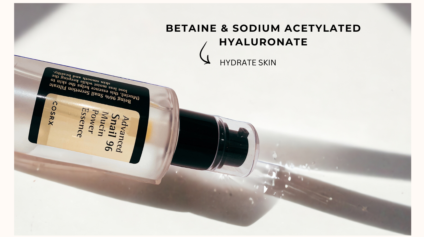 Snail Secretion Filtrate, Betaine, Butylene Glycol, 1,2-Hexanediol, Sodium Polyacrylate, Phenoxyethanol, Sodium Hyaluronate, Allantoin, Ethyl Hexanediol, Carbomer, Panthenol, Arginine