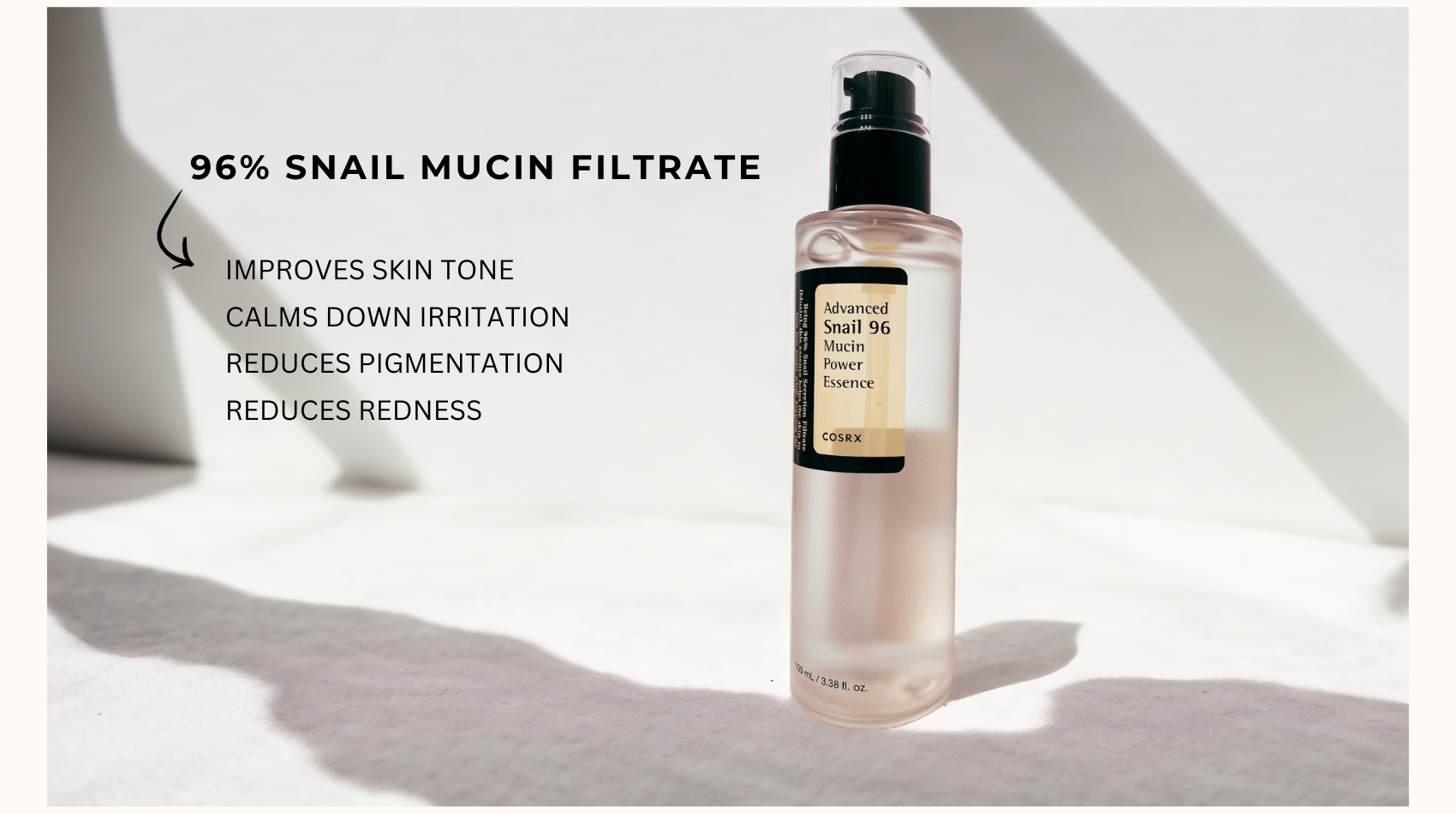 Contains 96% snail secretion filtrate, known for its healing and moisturizing properties. Perfect for the minimalistic skincare routine.