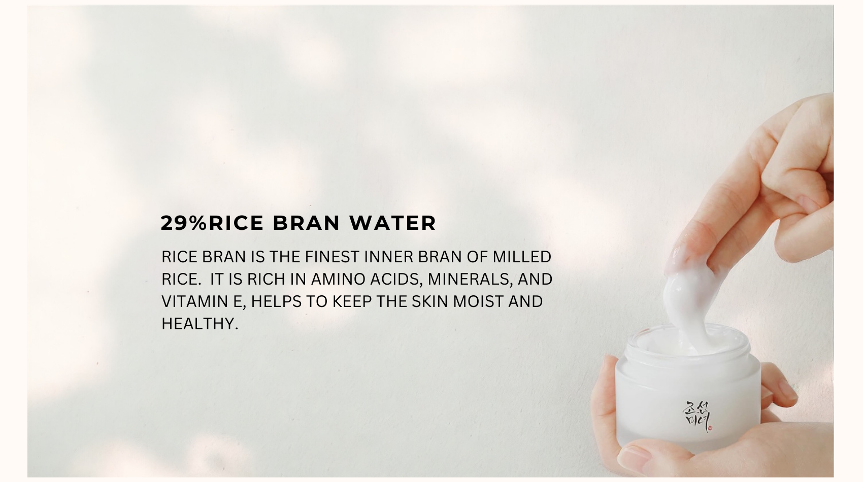 Rice bran is the finest inner bran of milled rice. In the Joseon Dynasty, rice bran water was used like the toner of today. It was called 'Beauty Water', used for beautiful skin. Rice bran, rich in amino acids, minerals, and vitamin E, helps to keep the skin moist and healthy.