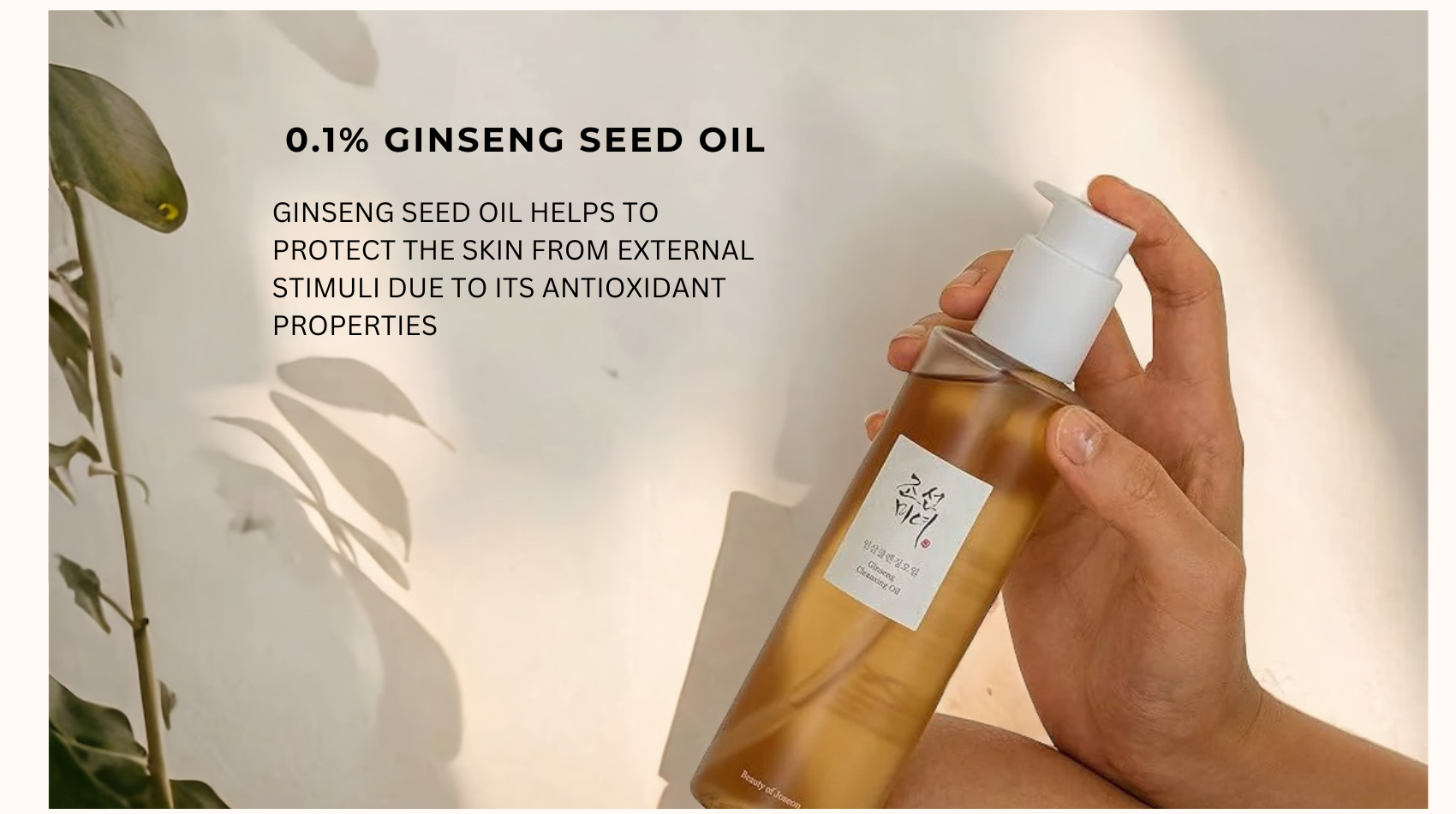 The Beauty of Joseon Ginseng Cleansing Oil contains 50% Glycine Soja (Soybean) Oil extracted from glycine soja, which gently melts away waste without clogging the pores, and 0.1% Ginseng Seed Oil, known to boost blood circulation in the skin and slow down the process of aging. Additionally, Curcuma Longa (Turmeric) Root Extract is full of natural antioxidants and helps to protect the skin against premature aging as well as wrinkles.
