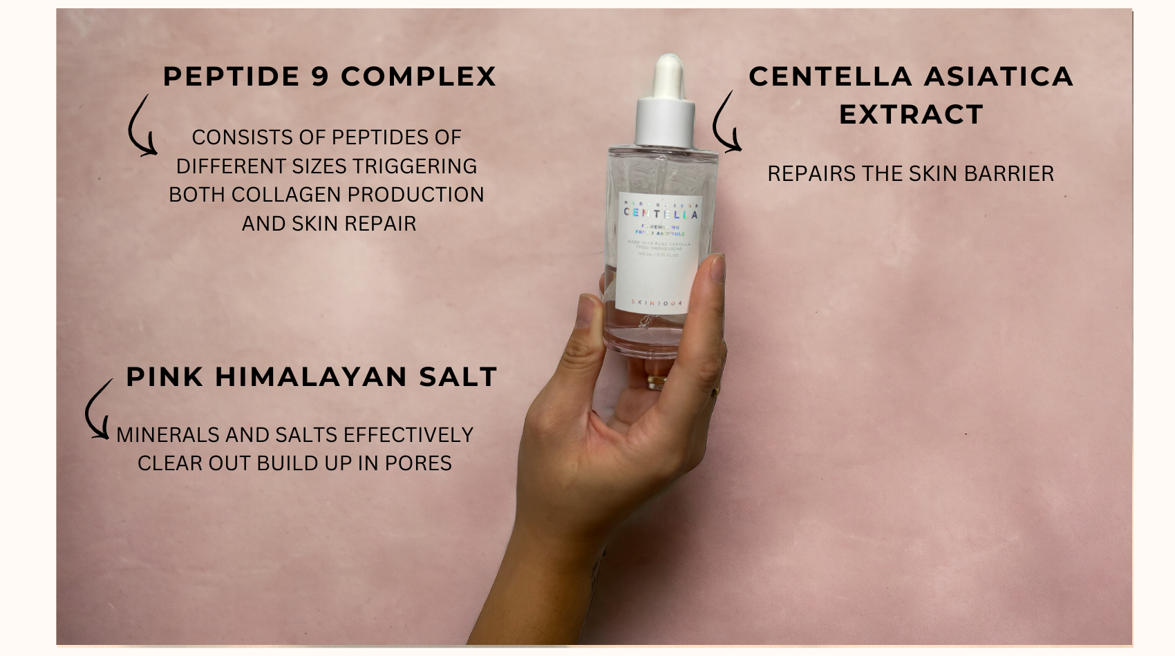 Centella Asiatica Extract (50.47%) (Soothing | Antioxidant | Moisturizer/Humectant), Aqua (Solvent), Butylene Glycol (Moisturizer/Humectant | Solvent), Propanediol (Moisturizer/Humectant | Solvent), 1,2-Hexanediol (Solvent), Aloe Barbadensis Leaf Extract (Moisturizer/Humectant | Soothing | Emollient), Glycereth-26 (Moisturizer/Humectant | Emollient | Viscosity controlling), Hydroxyacetophenone (Antioxidant), Glycerin (Skin identical ingredient | Moisturizer/Humectant), Carbomer (Viscosity controlling), Tromethamine (Buffering), Panthenol (Vitamin B5, | Soothing), Ethylhexylglycerin (Preservative), Disodium EDTA (Chelating), Dipotassium Glycyrrhizate (Soothing | Moisturizer/Humectant), Ammonium Polyacryloyldimethyl Taurate(Viscosity controlling), Biosaccharide Gum-1 (Soothing | Moisturizer/Humectant), Hyaluronic Acid (Skin identical ingredient | Moisturizer/Humectant), Hydrolyzed Hyaluronic Acid (Moisturizer/Humectant), Sodium Hyaluronate (Skin identical ingredient | Moisturiser/Humectant), Hydroxyethylcellulose (Viscosity controlling), Chamomilla Recutita (Matricaria) Flower Extract (Soothing | Antioxidant), Mineral Salts, Tripeptide-3 (Cell communicating ingredient), Acetyl Hexapeptide-8 (Cell communicating ingredient | Moisturizer/Humectant), Acetyl Octapeptide-3 (Cell communicating ingredient | Moisturizer/Humectant), Copper Tripeptide-1 (Cell communicating ingredient | Soothing | Antioxidant), Palmitoyl Pentapeptide-4 (Cell communicating ingredient), Palmitoyl Tetrapeptide-7 (Cell communicating ingredient), Palmitoyl Tripeptide-1 (Cell communicating ingredient), Tripeptide-1 (Cell communicating ingredient), Tripeptide-2 (Cell communicating ingredient).