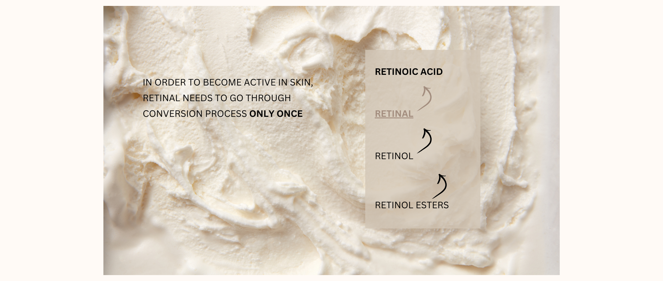 Retinal is the intermediate step between retinoic acidand retinol, meaning it needs only one conversion step to become active in the skin.